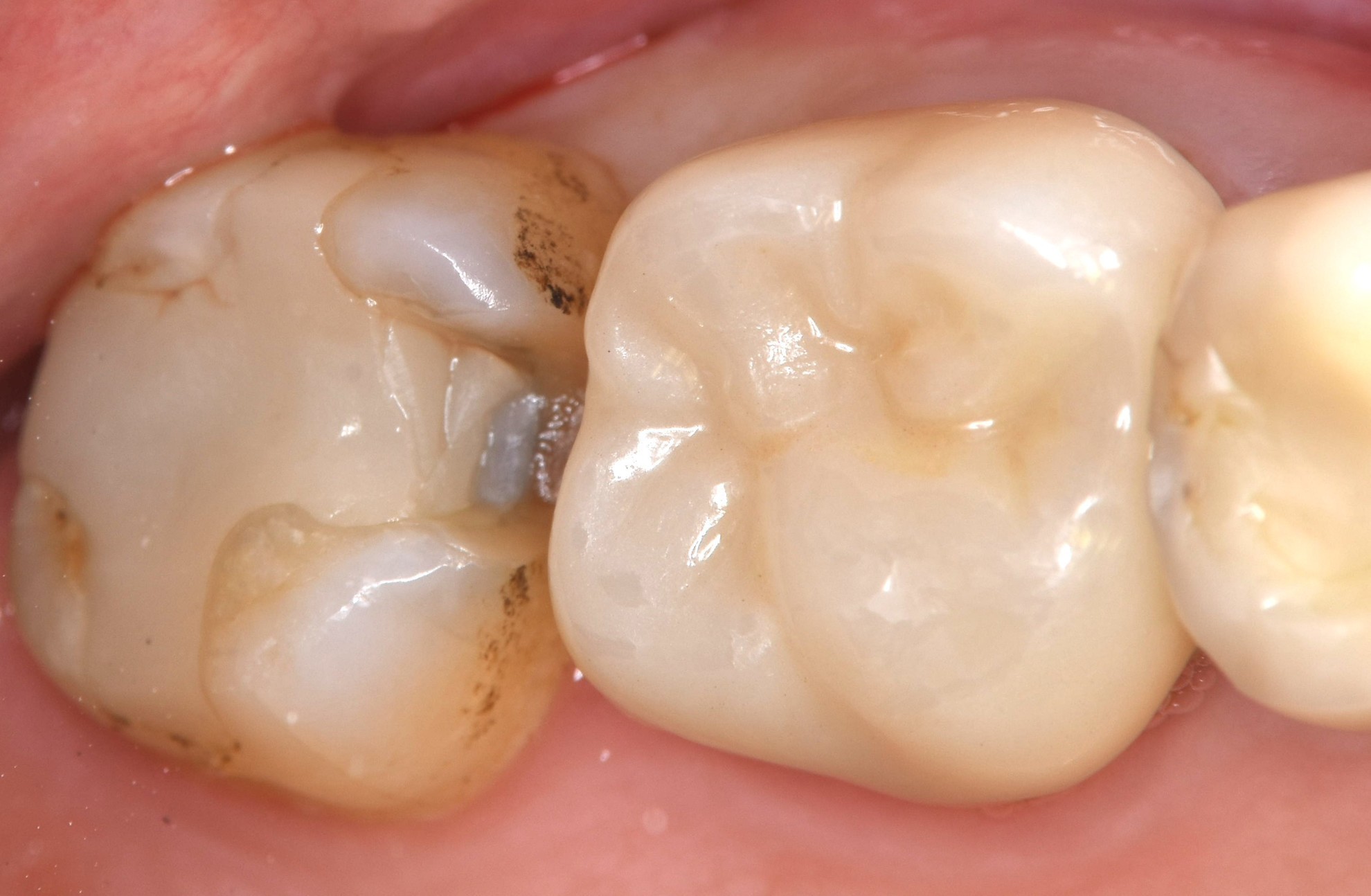 画面左側が一番奥の歯になります 昔詰めたものがかけたとのことです なんとなくひび様のものも見えます