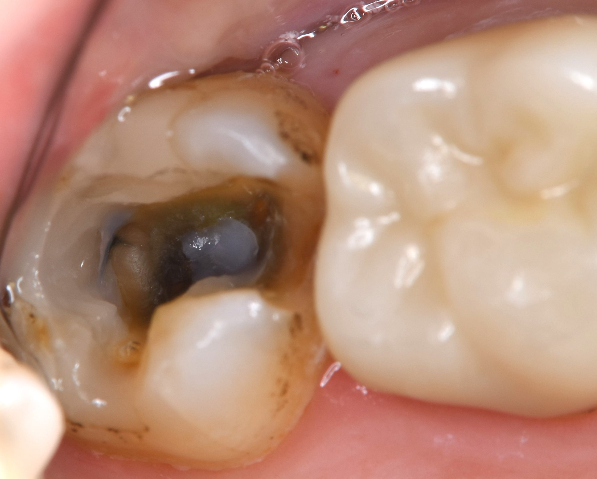 今回は、噛む面(咬合面)の大きさだけに限らず、もともと入っていた詰め物が、”深い”ことがわかりました。さらにその下には、黒っぽい歯質がみることができます。これをう蝕検知液という、虫歯が染まる液体を利用して、きれいにしていく必要があります。ここで虫歯が深すぎると、神経を守る治療(広い意味でのVPT)、神経(根)の治療(根管治療)が必要になる場合もあります。